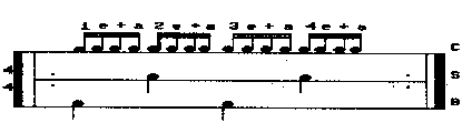 HINT: On top of the 16th rock example (above) you will see the 'apprroved' counting procedure. I rarely use it myself. It tends to confuse as much as it helps. It often helps (some people) to say the actual words "one,ee,and,aah,two,ee,and,aah" and so on. You will be saying "and" with each "+" (plus-sign) that you see. Pat your foot as you say "one" and tap your left hand as you say "two". Follow through and keep it going. Try it! If the counting tip helps, then use it. Otherwise just imitate the SOUND of the rhythm, either from the audio file or the video file.