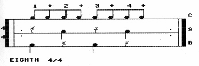 The following few pages will provide you with the basic beat patterns needed to play almost any song, regardless of your personal taste in music. As you study and learn these beats, notice that a mathematical pattern becomes evident between the speed (or tempo) of the beat and the number of cymbal (hi-hat) notes being played. Slow songs require more fill notes on the cymbal and fast songs require less. (Hairstyles and body-art have nothing what-so-ever to do with any of this.)