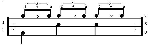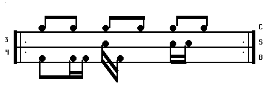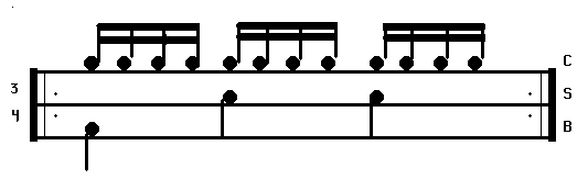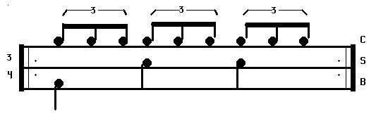 The Waltz beat gets its name from a dance, based on three steps and a three-count measure. According to Webster's dictionary, the term originated from Old High German walzan, meaning to turn or roll. It first appeared in 1781. The dictionaries and encyclopedias all seem to insinuate 3/4 time only. We will begin with the slower forms of the rhythm and move into the quicker tempos one-at-a-time.